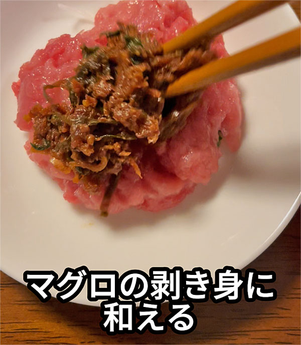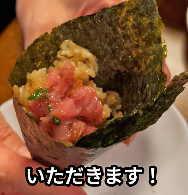 ●玄米手巻き寿司のおいしい食べ方!マグロの剥き身に、たっぷり薬味入りもろみ漬けを合わせました。