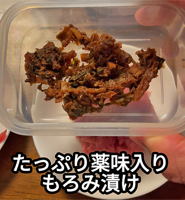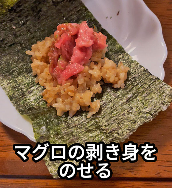 玄米手巻き寿司のおいしい食べ方!マグロの剥き身に、たっぷり薬味入りもろみ漬けを合わせました。