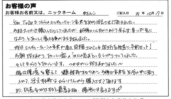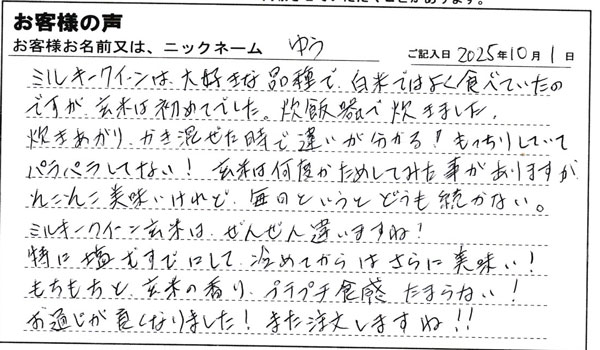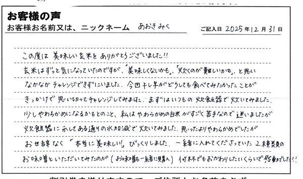 お客様から「玄米ご飯が美味しく食べられました!」とお手紙を頂きました